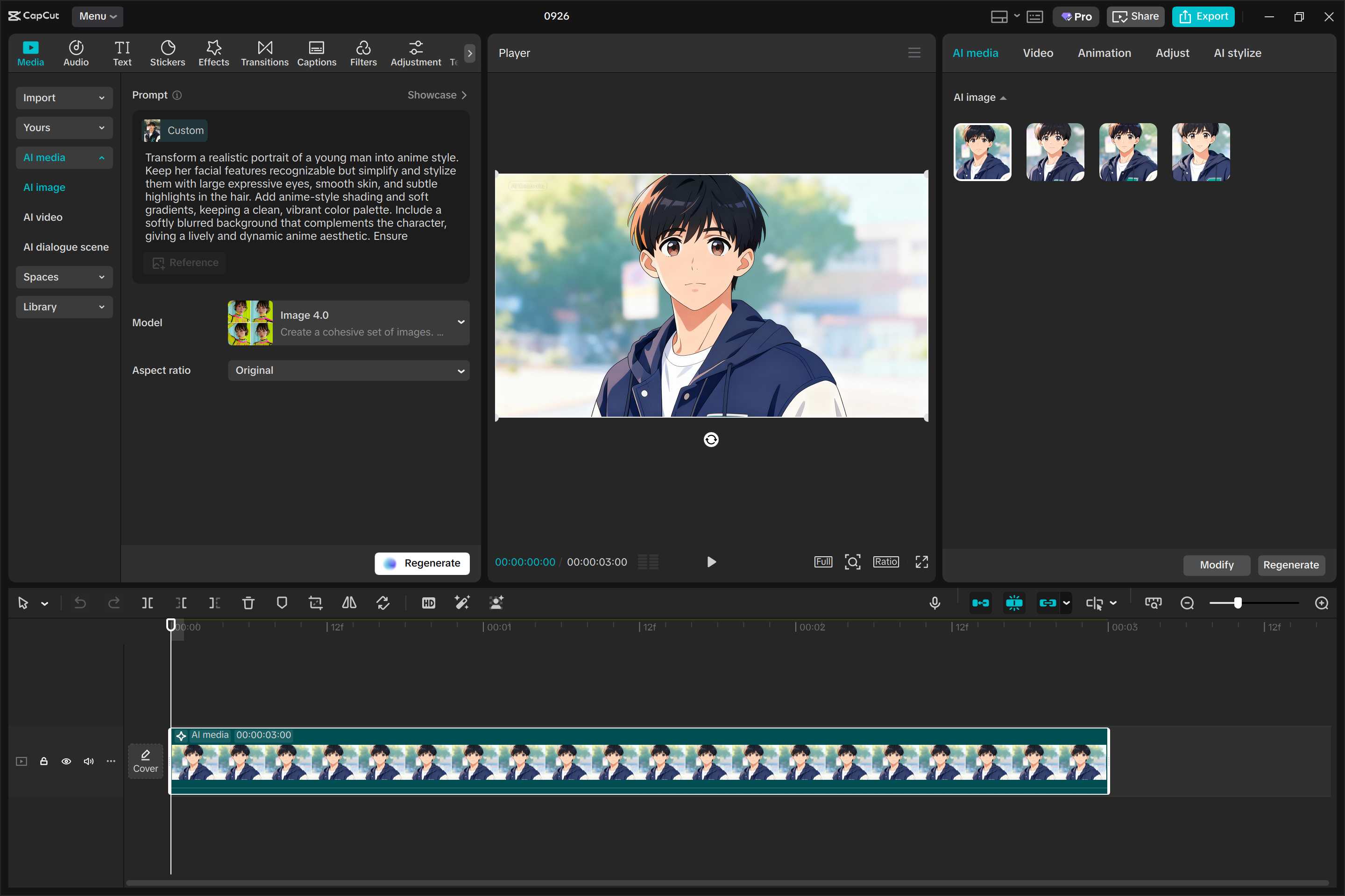 Go to "Scenes" > "Media", then click any automatically added image or clip to replace it with your own. Drag and drop files to align with your script, select from CapCut's media library, or generate new visuals with AI. Use the Voiceover tool to experiment with different voice styles.