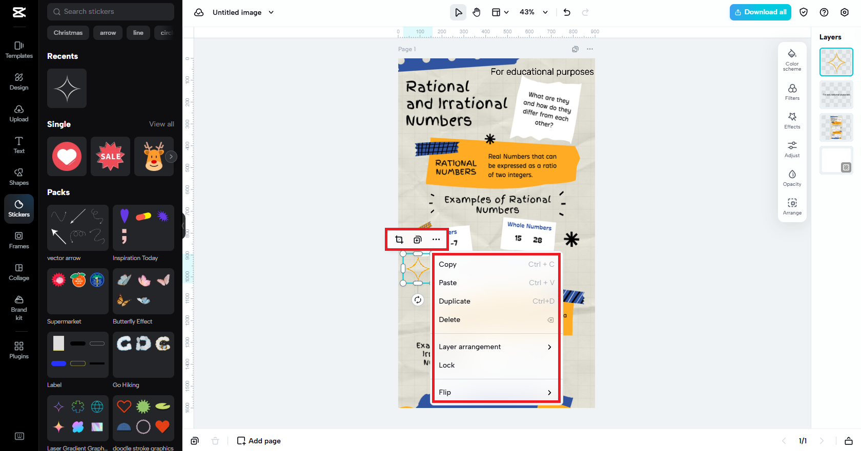 Once you upload your infographic image onto CapCut Web's servers, you will be presented with the platform's advanced editing tools and interface. Kickstart the editing process by first exploring the options on the right-hand side of your screen, which includes applying filters and effects, playing with the layers (adding or adjusting) of your infographic elements, and making photographic adjustments (color, light exposure, details, and opacity).