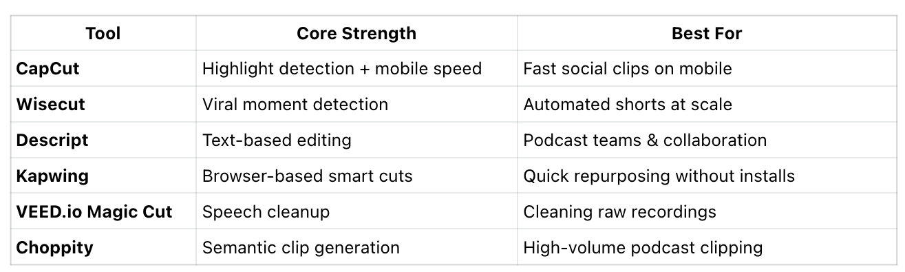 Below is a quick overview of the six tools I reviewed in this article, all capable of acting as an AutoCut agent for podcast video repurposing: